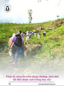 Đoàn chúng tôi dừng chân tại một sườn núi nằm dọc ven đường thuộc Thị trấn Khâm Đức, huyện Phước Sơn, tỉnh Quảng Nam. Vừa xuống xe đập vào mắt chúng tôi là những dãy núi trập trùng xanh mơn mởn, thời tiết nắng đẹp, khí trời mát mẻ ai nấy đều rất thích thú. Để đến được rẫy lúa, chúng tôi phải đi bộ trên một quãng đường dài khoảng chừng 1km khá dốc và có đoạn nằm xuống bám vào cây để leo.